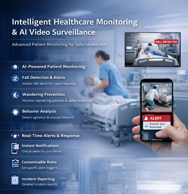 • Fall Detection & Alerting — Our AI automatically identifies when a patient falls and triggers instant alerts so staff can respond immediately, reducing risk and improving outcomes.